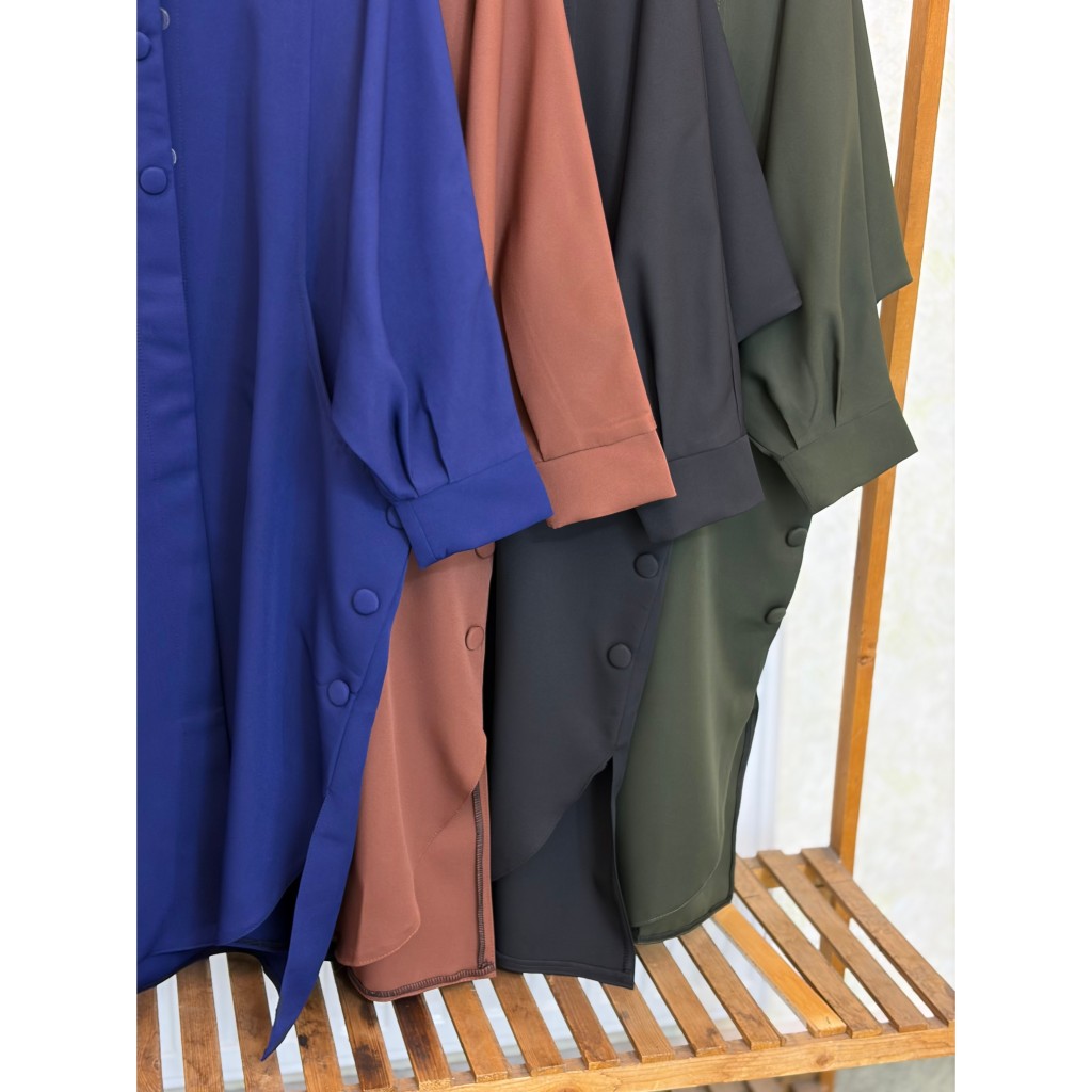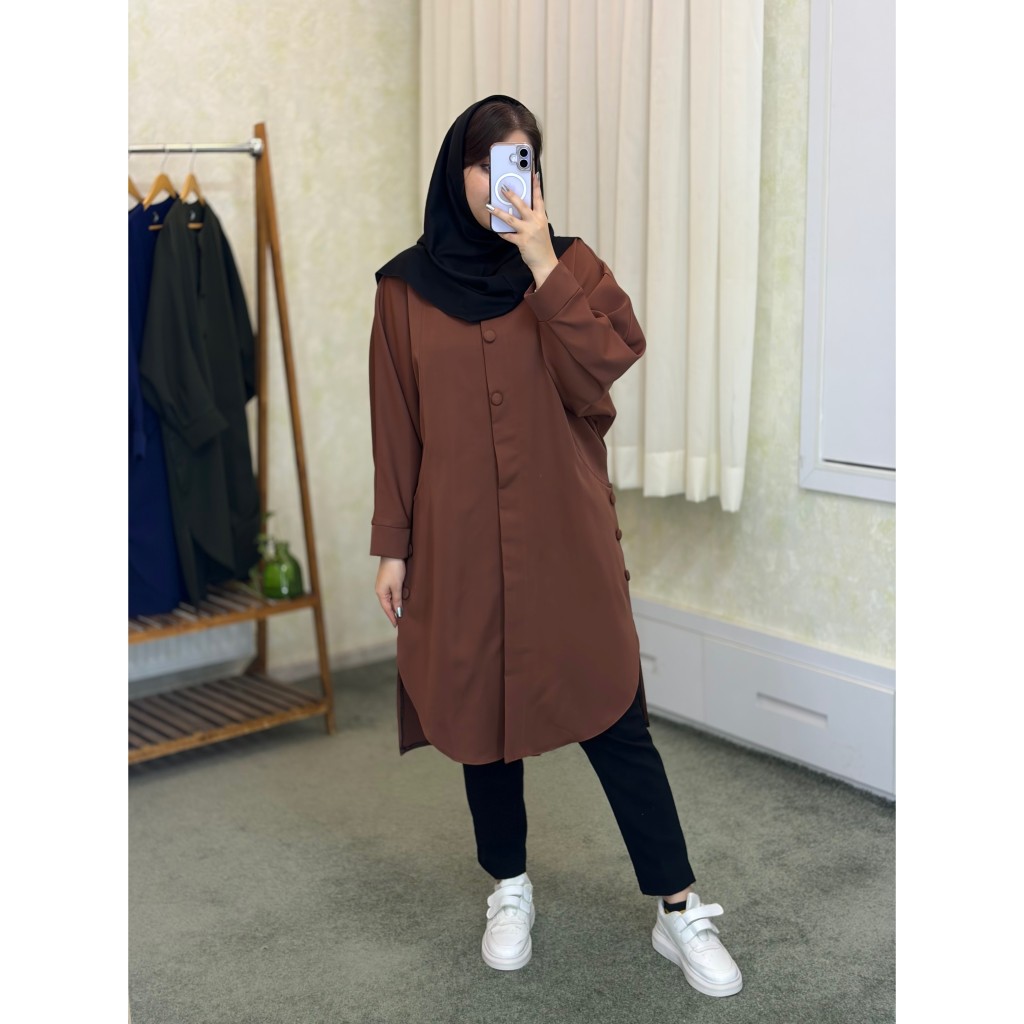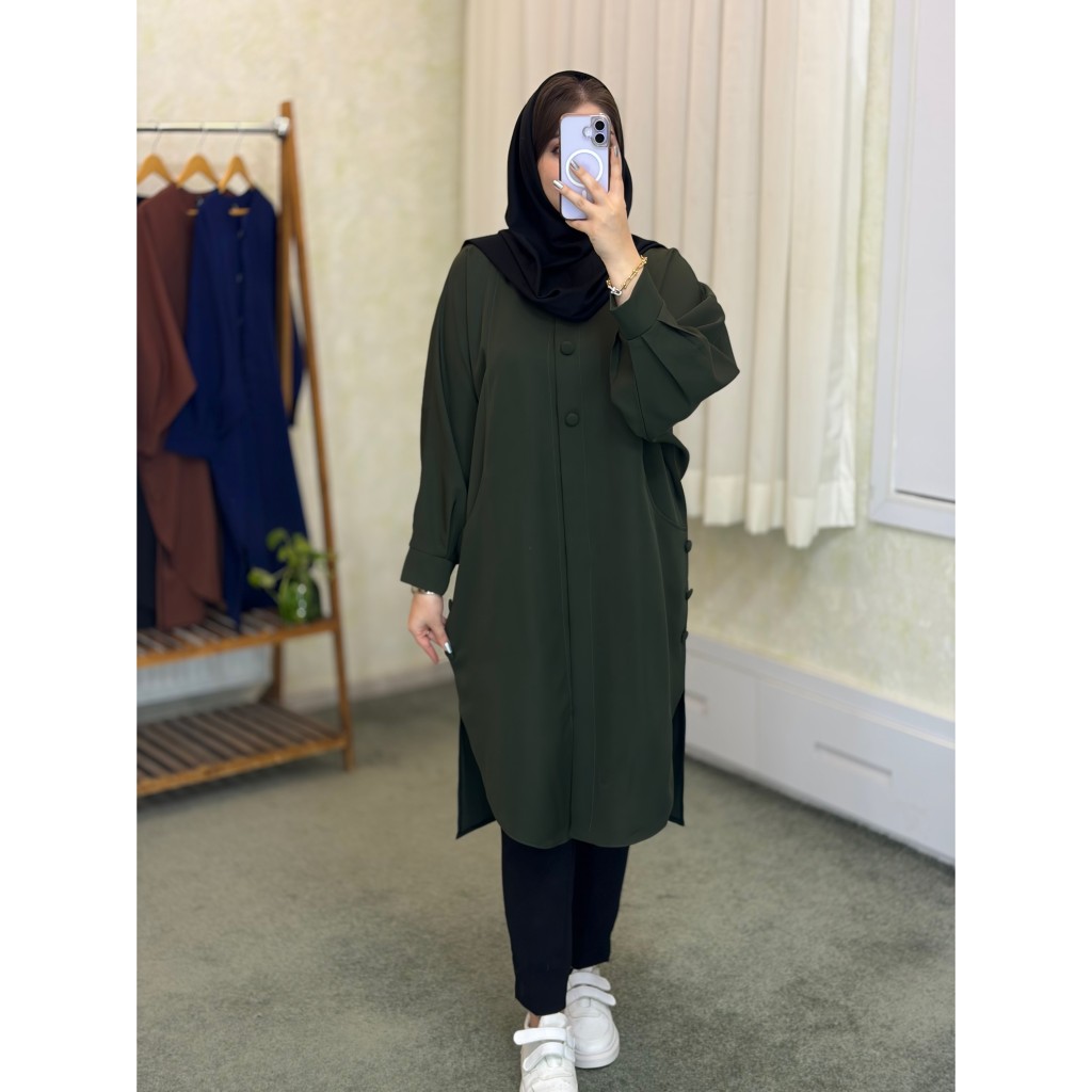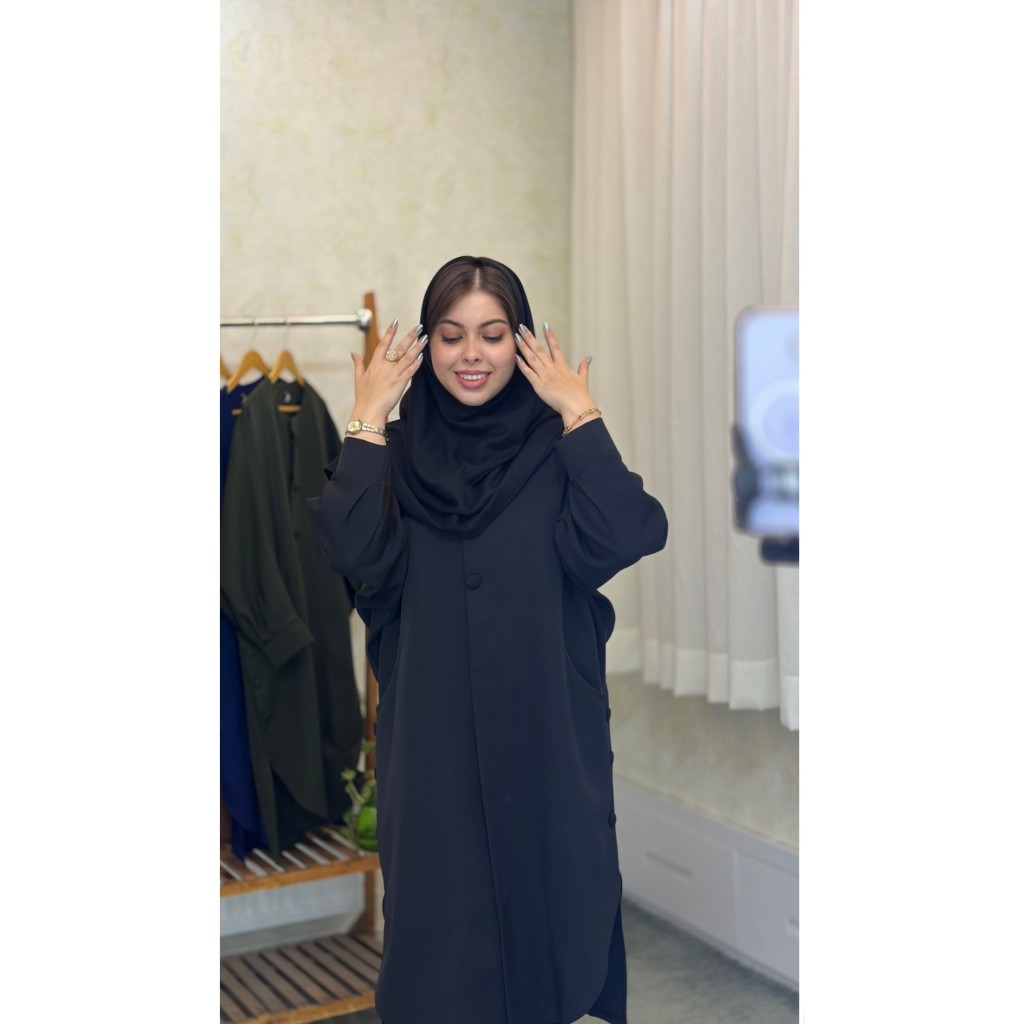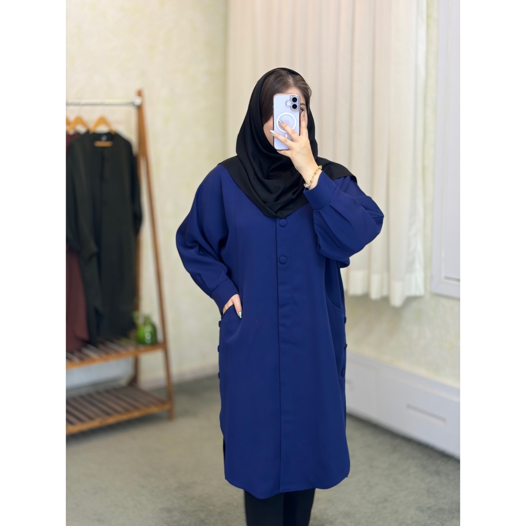 قد لباس از جلو ۱۰۵ از پشت ۱۱۰ قد استین ۶۰ جلوی لباس سه تا دکمه نما و از زیر تا زانو دکمه مخفی داره و دو عدد جیب در دو سایز سایز یک مناسب تا ۴۴ و سایز دو مناسب تا